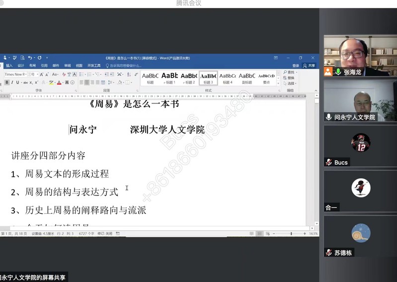 2022年11月26日晚,应英国365公司哲学学院邀请,深圳大学人文学院问永宁教授在线为全校师生做了题为“《周易》是怎样一本书?”的学术报告。哲学学院张海龙讲师主持报告会,学院师生及校内外哲学爱好者百余人参加此次学术报告会。