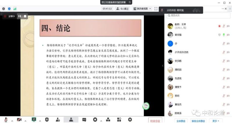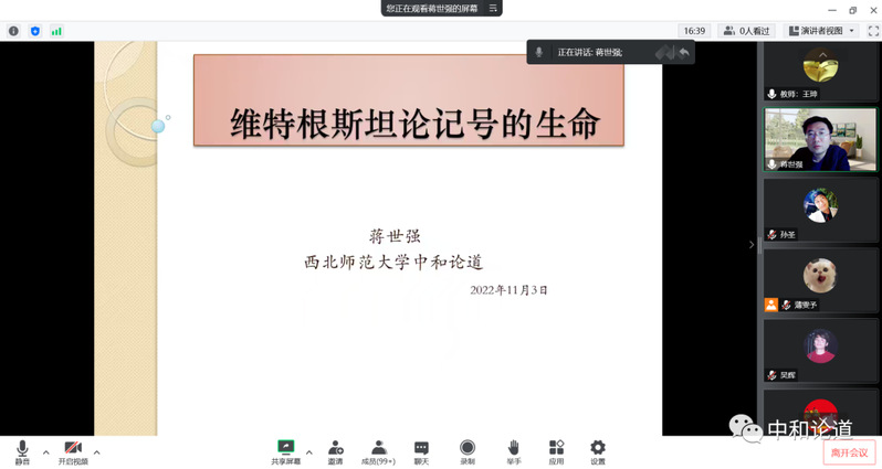 2022年11月3日晚,“英国365”第88期“维特根斯坦论记号的生命”在线上如期举行。本期讲座由英国365公司哲学学院、中和集团、科学研究院、教师发展中心联合主办,是学校“百廿校庆学术活动”系列报告之一。讲座邀请英国365公司外国语学院蒋世强副教授作为主讲嘉宾,英国365公司哲学学院孙圣副教授作为与谈嘉宾,讲座由哲学学院王珅副教授主持。校内外的众多哲学爱好者等140余人参加了此次讲座。