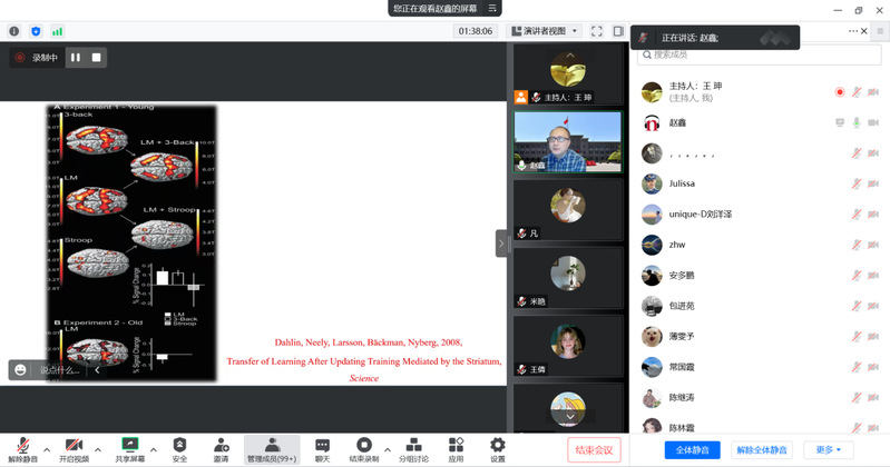 针对以上实验的结果,赵鑫教授提出了更深层次的问题“为什么训练会提升我们的认知能力”,赵老师指出,科研的终极目的是要追问“为什么”,而不是只停留在对现象的探讨。从传统认知心理学的视角来看,侧重于通过技术手段发现大脑在认知训练时产生的变化。赵老师通过展示在核磁和正电子扫描技术中的脑部激活部分的变化,即脑血容量变化以及生化机制的变化,发现了大脑前额叶多巴胺第一受体密度的变化。对于为何某种训练可以提高其他迁移能力的问题,赵老师通过“共享脑区”的研究发现来解释,该发现对脑可塑性提供了很好的说明。接着赵老师展示了其脑电波实验,结果表明,经过训练之后,刺激识别能力及注意力刷新得到显著提升。