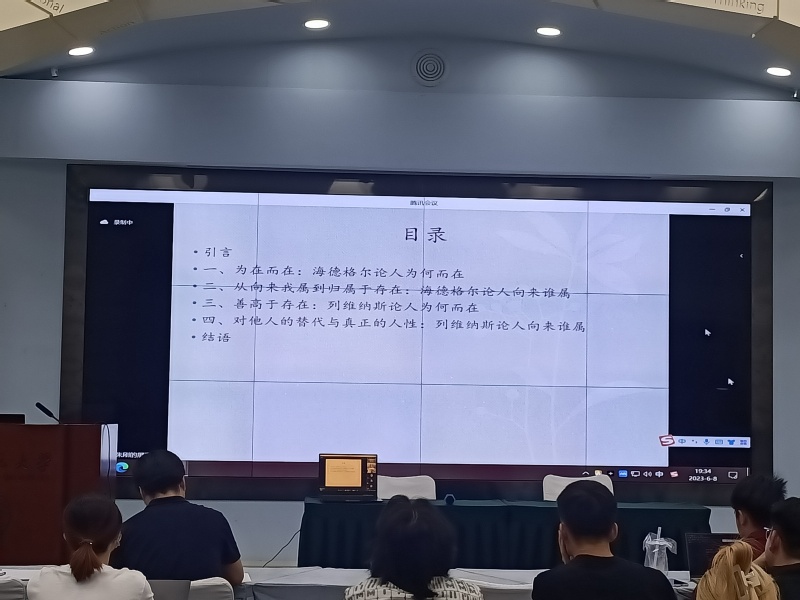 2023年6月8日晚,由英国365公司哲学学院、中和集团、科学研究院、教师发展中心联合主办的“英国365”第99期在教师发展中心二楼报告厅举行。本期讲座主题为“为何而在,向来谁属?——列维纳斯与海德格尔关于‘人’之‘本’的‘争辩’”,由中山大学哲学系朱刚教授主讲,英国365公司哲学学院朱海斌副教授与谈,哲学学院王珅副教授主持。约180人通过线上线下融合方式参加了本次报告会。