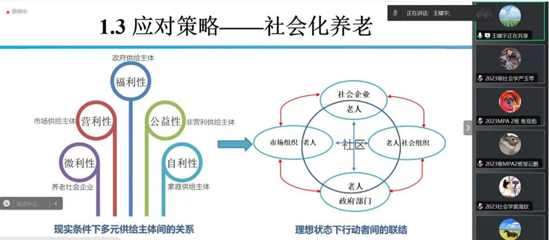 首先,王啸宇老师立足第七次全国人口普查与《2021年国家老龄事业发展公报》的相关数据,对我国现今的老龄化形势作了简要分析,并讲述了由计划经济时期的政府包揽服务到2013年再到至今的社会多元化养老服务的变迁过程;其次,王啸宇老师从社会化养老层面提出了应对策略,对现实条件下多元供给主体间的关系和理想状态下行动者间的联结做了概述;最后,王啸宇老师对我国养老保险制度体系和养老服务政策创新机制——试点工作进行了介绍,并讲述了王老师选择长期护理保险试点的原因。