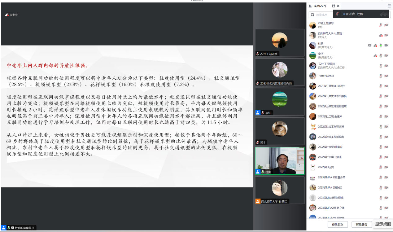 讲座尾声,杜老师对同学们提出的问题进行了详尽解答。李怀老师对此次讲座表达了衷心感谢,认为本次讲座深入浅出、议题新颖、观点明晰、引人深思,启发了我们在数字社会实现有效的老龄社会治理过程中如何解决老年人与数字技术的关系,如何清晰分解和剖析老年人在使用数字技术时的差异问题。