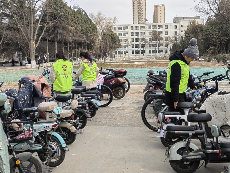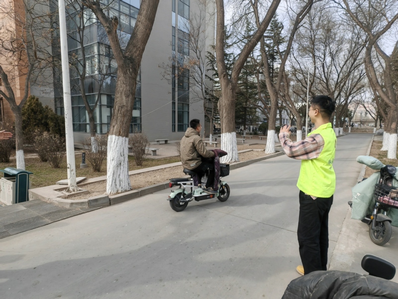 学院学生会、劳动育人实践项目组的同学们利用课余时间在学院楼下值班站岗,引导来往电动车安全行驶、规范停放,同时向路过的同学们科普骑行安全知识,通过自己点点滴滴的付出努力营造安全和谐的校园环境。