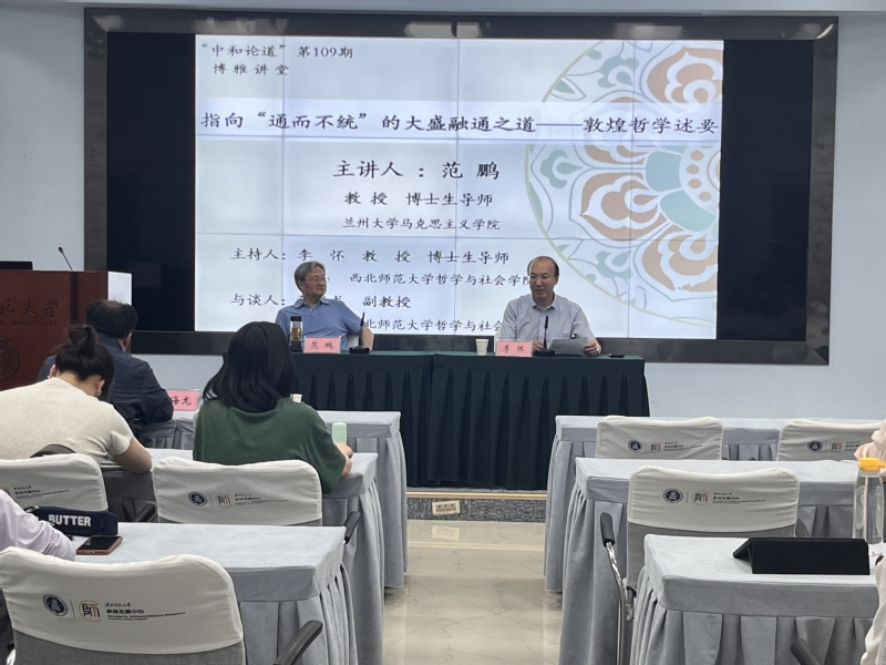 在交流讨论环节,参加讲座的各位老师、学生与范鹏老师进行了积极互动、交流与讨论。范鹏老师就“敦煌哲学属于发现的哲学还是建构的哲学?”“如何处理敦煌哲学与少数民族哲学之关系?”“《老》《庄》之‘道’、金岳霖之‘道’与敦煌哲学大盛融通之‘道’的不同及其承递关系”等问题进行了回应与解答。李怀院长对本次讲座的内容及互动观点进行了回顾与总结,并再次向范鹏教授的精彩讲座表示感谢。