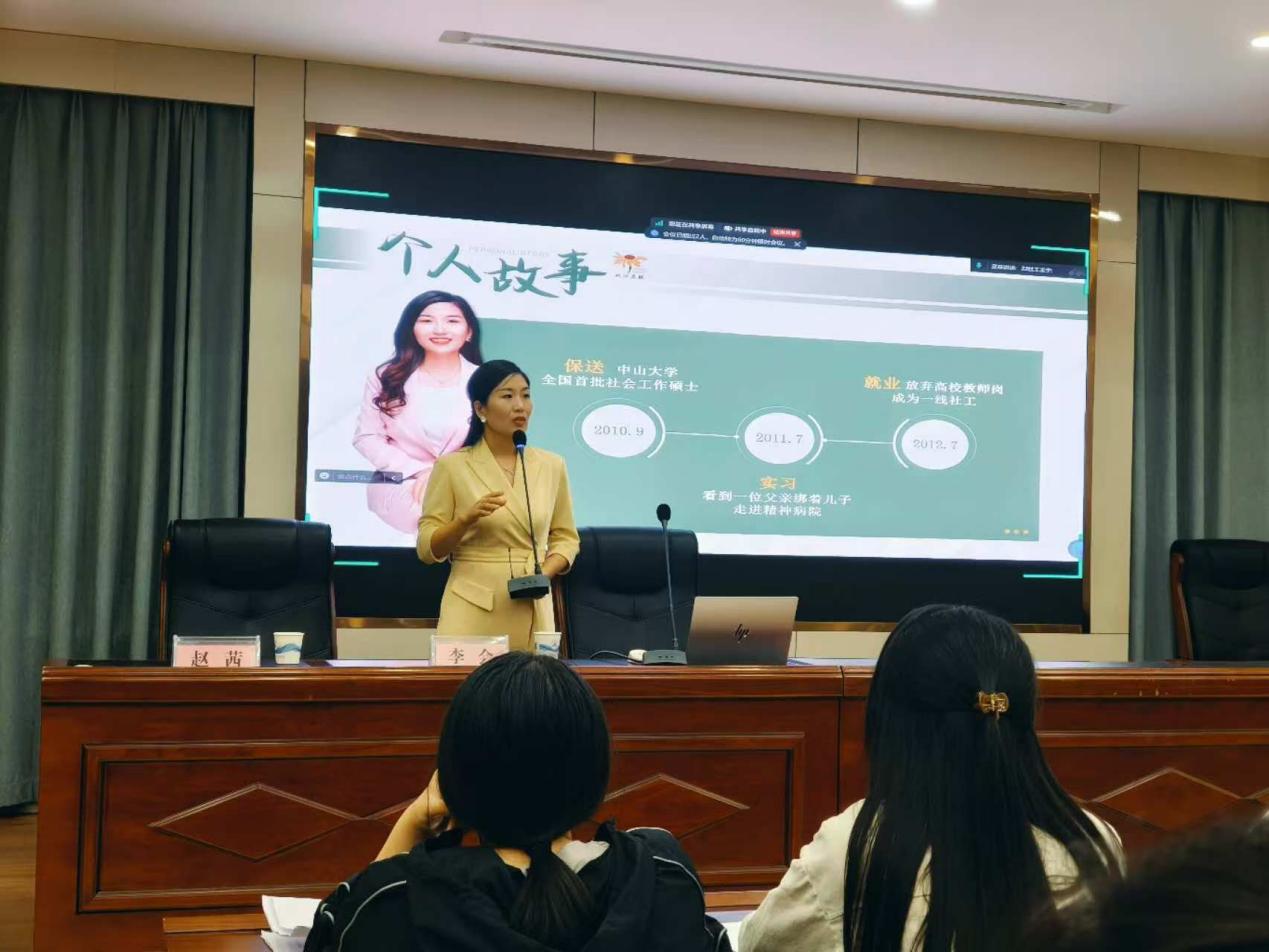 讲座初始,李会老师分享了自己被选为社会工作硕士的意外经历,学校为社工提供专门的培训地点,并有教授提供实习机会,但她发现实际工作中更多的是行政事务而非预期的深入个案工作,这让她感到失望。不过,李会老师表示,在一系列的实习过程中,尤其是与精神病院患者的互动让她深刻体会到了社会工作的价值与使命感,同时,李会老师详细地描述了实习经历中的挑战与感动瞬间,如帮助患者策划露营音乐会、建立人际关系等,这些经历加深了她对社会工作的认识与热爱。在实习中,李会老师不仅完成了分配的任务,还收到了一面锦旗,并发表了研究论文,这使得她对社工工作的理解和参与正在逐步深入。尽管在初期面临身份认证、独立建案的挑战和情感投入所带来的压力,但是这些经历使她认识到自身是最适合从事社会工作的人选,通过专业的指导和个人努力,学习并掌握了更多的辅导技巧。李会老师感悟到,社会工作不仅需要处理服务对象的情绪,同时也需要自我反思与成长。随后,李会老师分享了她在医院组织音乐治疗小组并且开展夏季露营音乐会活动的经历,通过利用音乐治疗帮助患者恢复自信和社交能力,从而提高生活质量。李会老师表示,这不仅证明了音乐治疗在康复中的作用,也展示了社会工作者在患者康复过程中的关键角色。