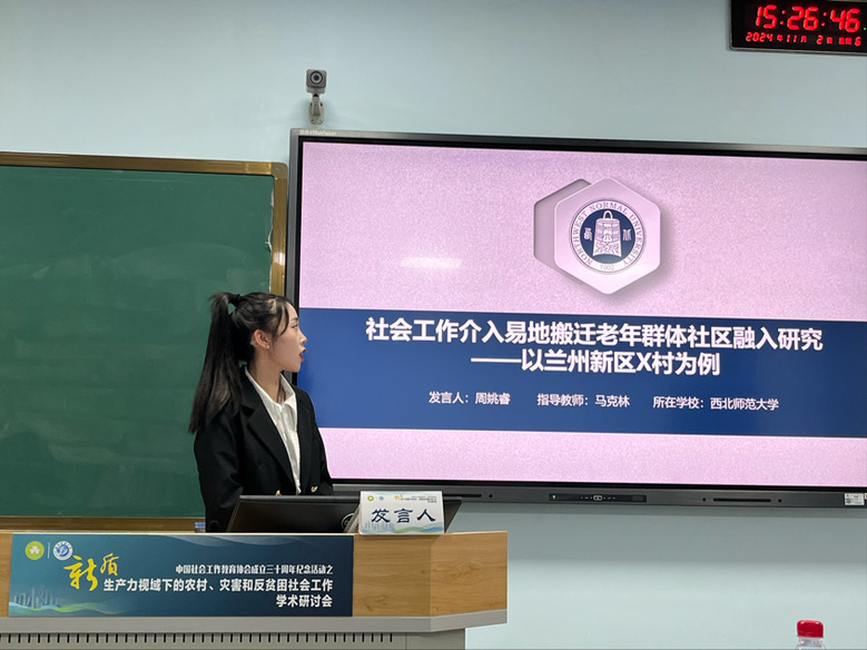 2024年11月1日至3日,“中国社会工作教育协会成立三十周年纪念活动之新质生产力视域下的农村、灾害和反贫困社会工作学术研讨会”在四川成都举行。我院2023级硕士研究生周姚睿提交的论文《社会工作介入易地搬迁老年群体社区融入研究——以兰州新区X村为例》入选会议论坛并获邀参会发言。