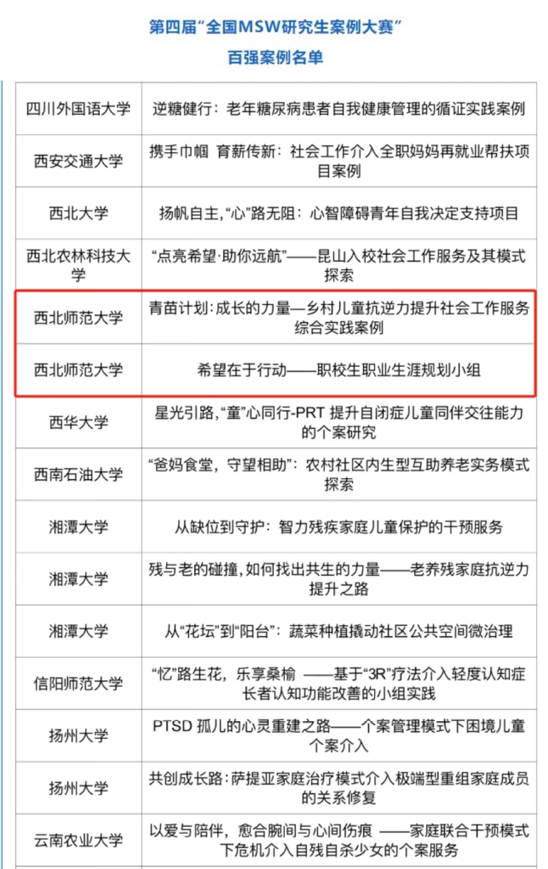 本次案例大赛中,我院《青苗计划:成长的力量—乡村儿童抗逆力提升社会工作服务综合实践案例》(负责人:张倩,指导老师:赵茜)、《希望在于行动——职校生职业生涯规划的小组工作》(负责人:陈旭,指导老师:谢丽丽)获得第四届“全国MSW研究生案例大赛”百强案例,其中《青苗计划:成长的力量—乡村儿童抗逆力提升社会工作服务综合实践案例》(负责人:张倩,指导老师:赵茜)获得第四届“全国MSW研究生案例大赛”四十强案例。