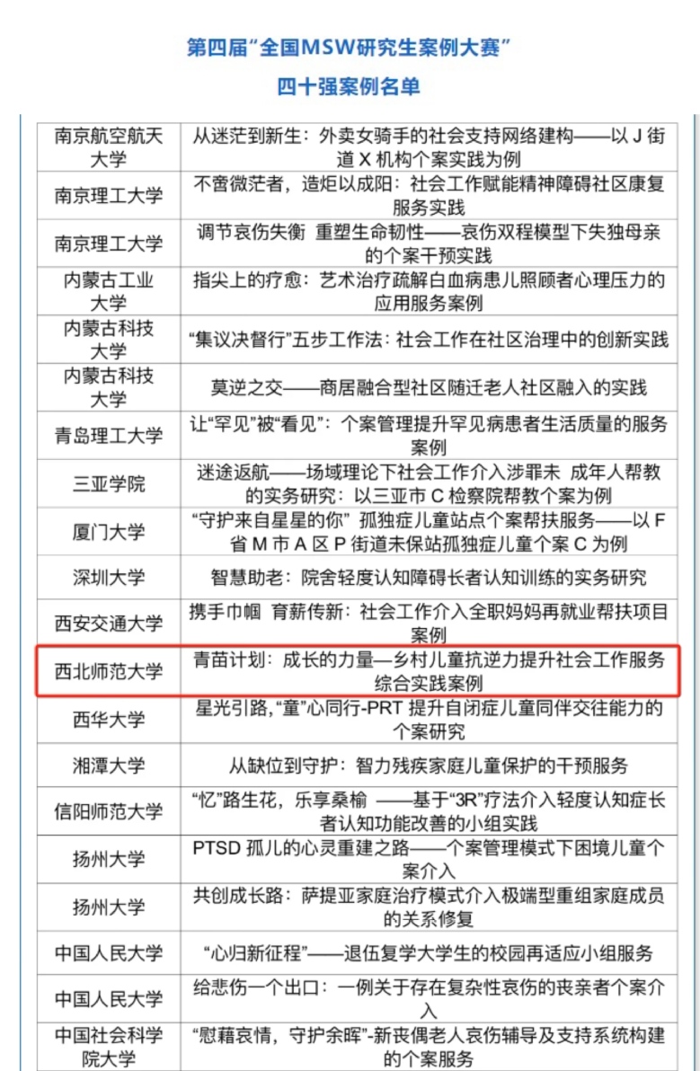 按照《第四届“全国MSW研究生案例大赛”工作方案》,根据初赛综合评分结果,经教指委秘书处研究,排名前40位的案例入选四十强案例,进入决赛。