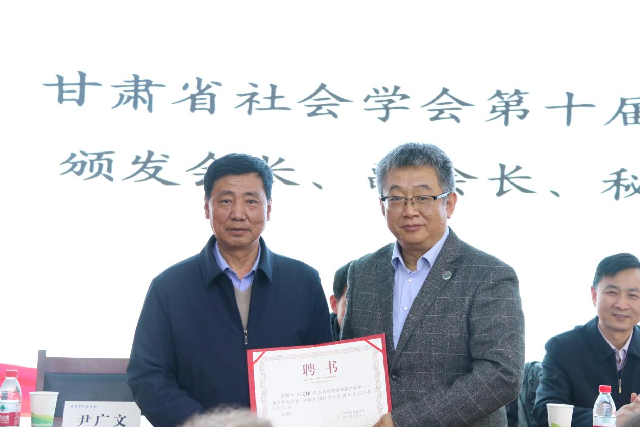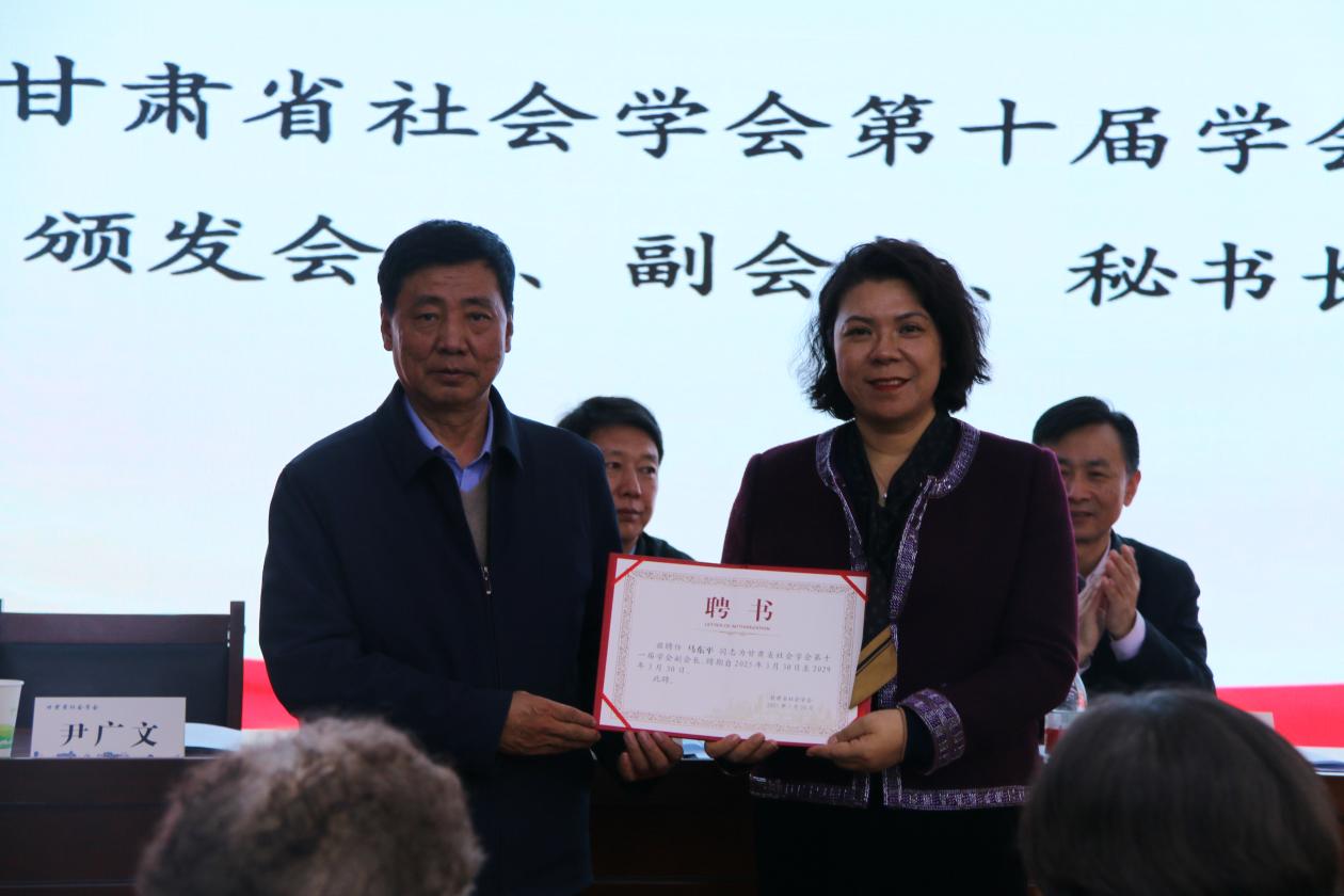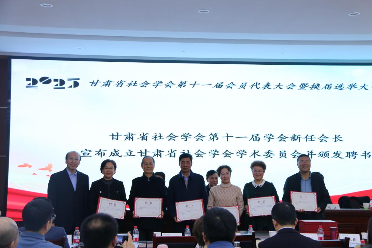 为更好推动新时代甘肃省社会学会高质量发展,表彰第九、十届理事会为推动甘肃省社会学会发展所作出的突出贡献者,选举环节新增一项议程,经学会第十一届会员代表大会暨理事会筹委会充分讨论、征求代表意见建议,甘肃省社会学会第十一届学会理事会决定设立甘肃省社会学会学术委员会,提名陈文江教授为学术委员会主任委员,贾应生教授、赵利生教授、文化教授、张永梅教授、张玉斌研究员为学术委员会委员。甘肃省社会学会第十一届学会会长李怀教授为甘肃省社会学会学术委员会主任及委员颁发聘书并合影留念。
