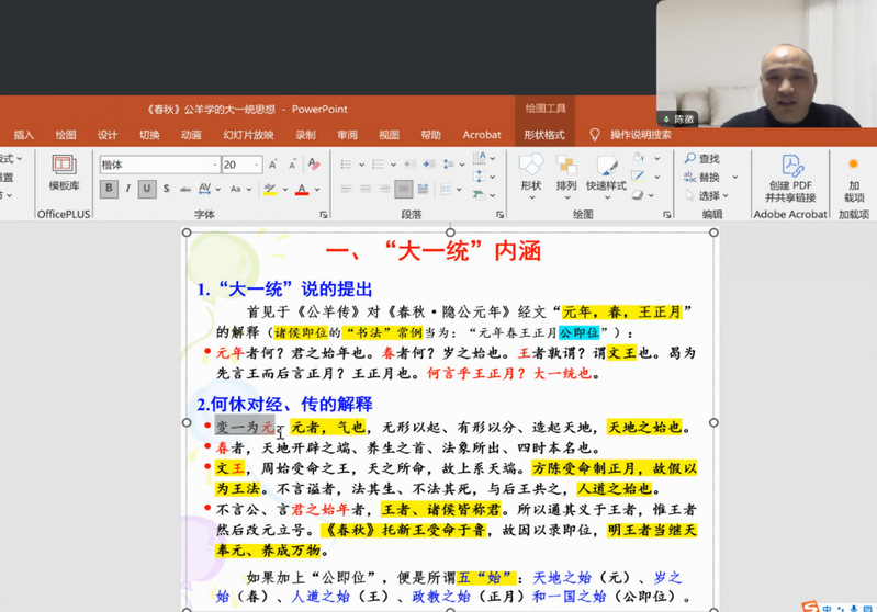 在“‘大一统’内涵”部分,陈教授从“大一统”说的提出开始,经何休对经、传的诠释,将“ 正五始”说托举出来,随后着重提到贯通“五始”的乃是“王”,从而自然递进到“大一统”诸字之意与关系的内涵部分。