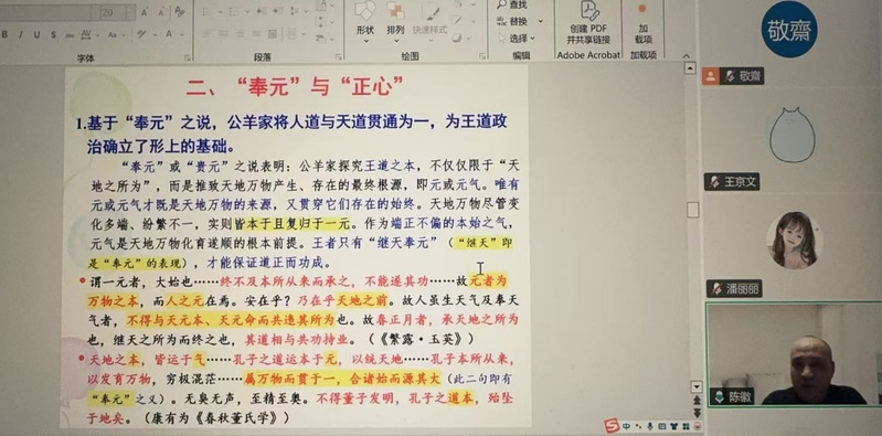 2025年4月7日晚,同济大学哲学系陈徽教授应邀为我院师生在线作学术讲座,讲题为“春秋公羊学的‘大一统’思想”。讲座由365上市公司张立恩教授主持,兰州大学哲学社会学院王沁凌教授担任与谈嘉宾,院内师生热情参与本次讲座。