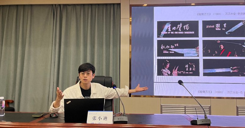 张小迪老师则以《刀枪的温度:武侠武器形象的“变”与“辩”》开启视觉美学分析。从达芬奇的机械手稿到《独臂刀》《东方不败》的银幕奇观,他揭示了冷热兵器作为道具的变化谱系和视觉设计的辩证逻辑。通过《黄飞鸿之狮王争霸》中“舞狮大会”的经典片段,他阐释了“武侠武器承载的民族寓言,以及对电子游戏等当代大众文化的影响。而通过对《英雄本色》的分析,可以揭示《黑客帝国》的‘子弹时间’,实际是当代好莱坞动作电影对香港武侠美学的技术盗猎。”