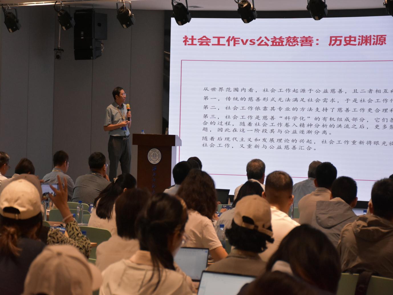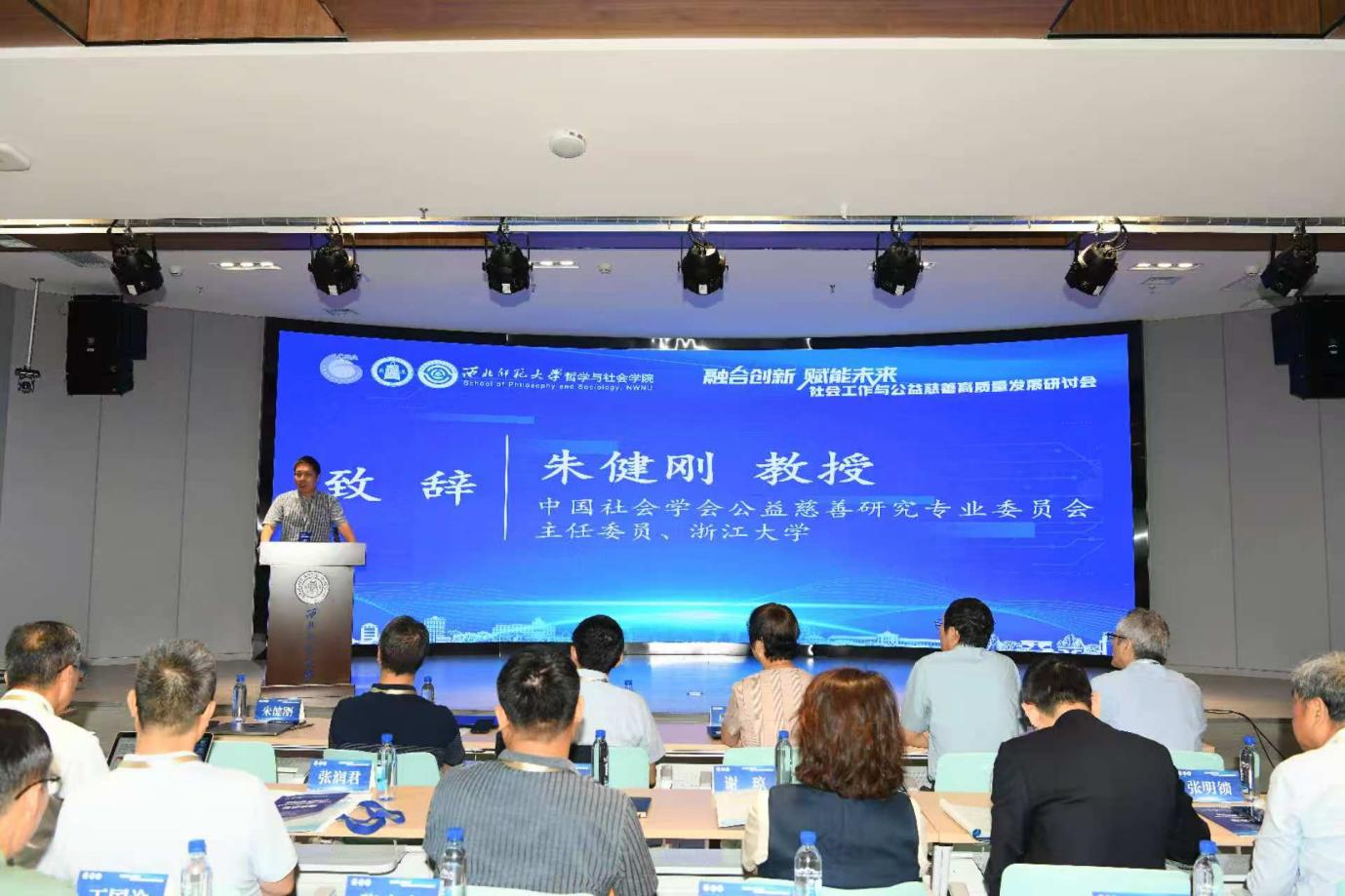 浙江大学社会学系教授、广州公益慈善书院创始院长朱建刚教授在致辞中指出,社会工作与公益慈善的融合创新,是我们这些做公益研究学者们的梦想。希望能够让公益慈善行业的从业者、学者和社会工作的学者和专业从业者有效连接、交流与合作。本次会议的核心主题“融合创新”,正是我们这个行业的突破途径。中央社会工作部的组建,为专业社会工作开辟了新局面。2024年9月,新修订的慈善法,更为公益慈善发展拓宽了空间,但发展的痛点也是清晰的。专业社会工作面临资源总量短缺困境,就西北地区而言,很多社工机构面临缺乏资源问题,各种需求难以满足。公益慈善领域缺乏科学理论和指引、专业方法的支撑,大量的无效公益现象严重削弱了行业的影响力和公信力。 破解这些难题的钥匙,我们专委会认为就在于这两个方面的融合与创新。公益慈善,可以凭借基金会,各种社会服务机构的社会性与动员力,为社会工作拓宽资源筹措的渠道,补上资源的短板。专业社会工作历经40年系统化培育的知识体系,专业人才为公益慈善注入专业内核,每一份善意都可以精确落地。我们希望在学术界有更多的学者能够在一起共同探讨社会工作与公益慈善的融合。创新不是一个简单的相加,而是一个深度的相融。为了实现共同富裕的目标及新治理格局下的社会的需求,我们需要探索一条新时尚、新工艺或者是社会工作的新道路。