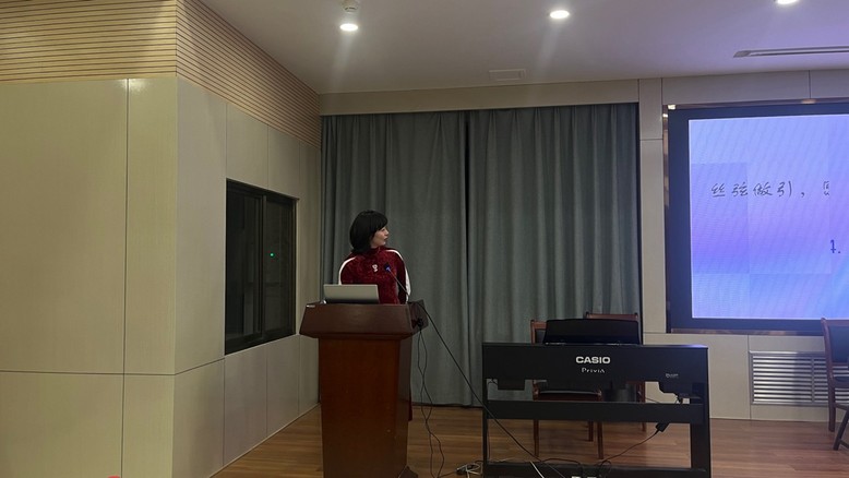 活动伊始,王珅老师隆重介绍了孙明霞教授作为学校唯一的古筝教授,她在古筝演奏与教学领域造诣深厚,获奖无数。孙教授并首先引领听众回溯古筝的千年文脉。她从古筝的秦地起源、形制演变(由汉代十二弦至当代二十一弦)讲到南北流派,并深刻剖析了古筝音乐中蕴含的儒家“和雅”、道家“自然”与法家“规则” 的文化基因。她特别指出,“音乐的前提是生命,生命的前提是呼吸”,精湛的技艺最终是为了开启内心情感的宝藏,赋予音乐以灵魂。