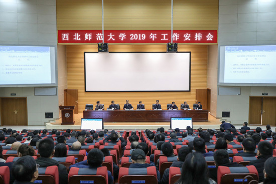 2月24日上午,西北师大在新校区毅然报告厅召开2019年工作安排会,安排部署2019年重点工作。党委书记张俊宗作会议讲话,校长刘仲奎对全年重点工作进行安排部署,副校长田澍通报2019年寒假工作,党委副书记刘玉泉主持会议,副校长董晨钟、李朝东、李建民,纪委书记姚志宏出席会议。